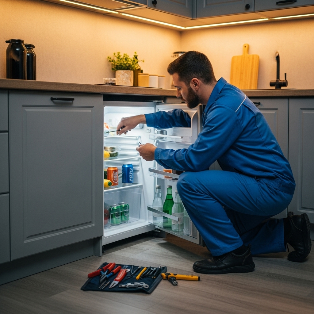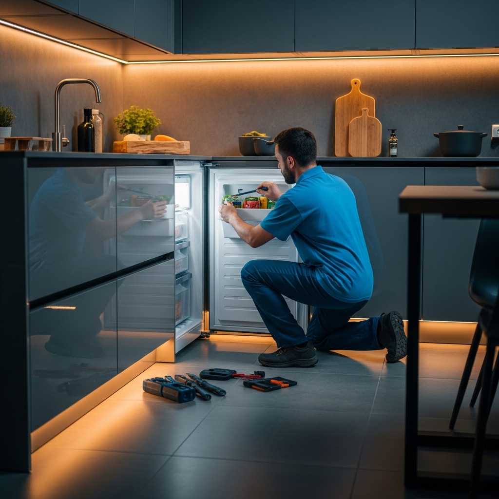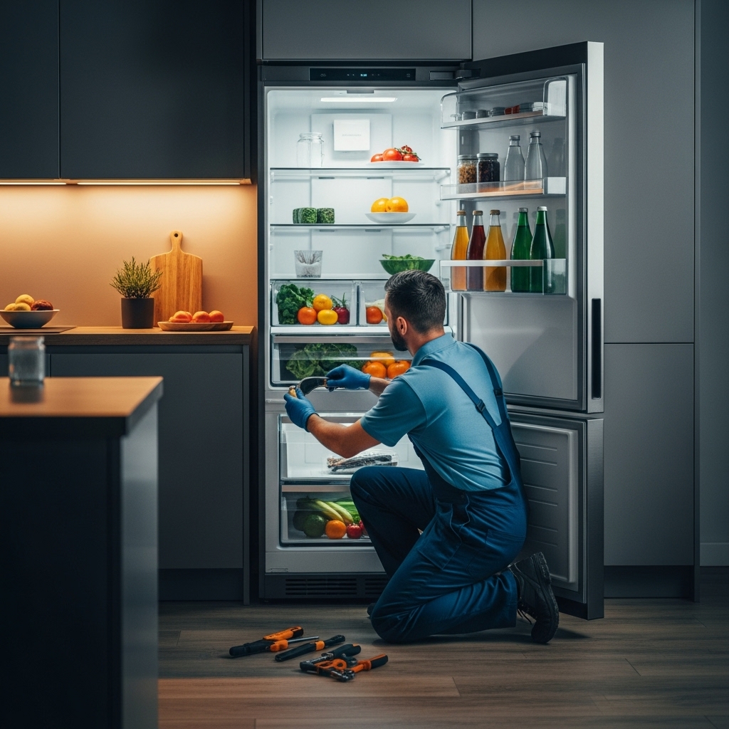 نقوم بفحص شامل للثلاجة، معالجة ضعف التبريد وتسرب الغاز، وضبط درجة الحرارة لضمان كفاءة عمل الجهاز.